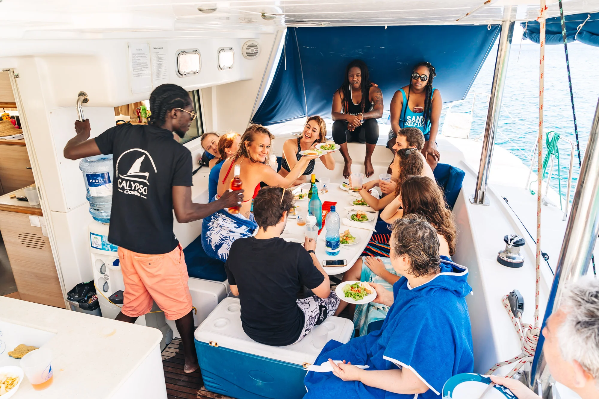 We were introduced to our French captain, Yannick, and he went over the safety guidelines we needed to follow while on board. One of the main things he pointed out was the sunscreen. We were instructed to apply sunscreen every hour since the sun gets really harsh out in the open water. We were also introduced to our chef who would be preparing all of our meals on board. There were already light snacks and coffee out for breakfast. There was also some liquor and mixers to make cocktails for ourselves. I tried the chef’s special rum punch but it was a little too sweet and strong for me.