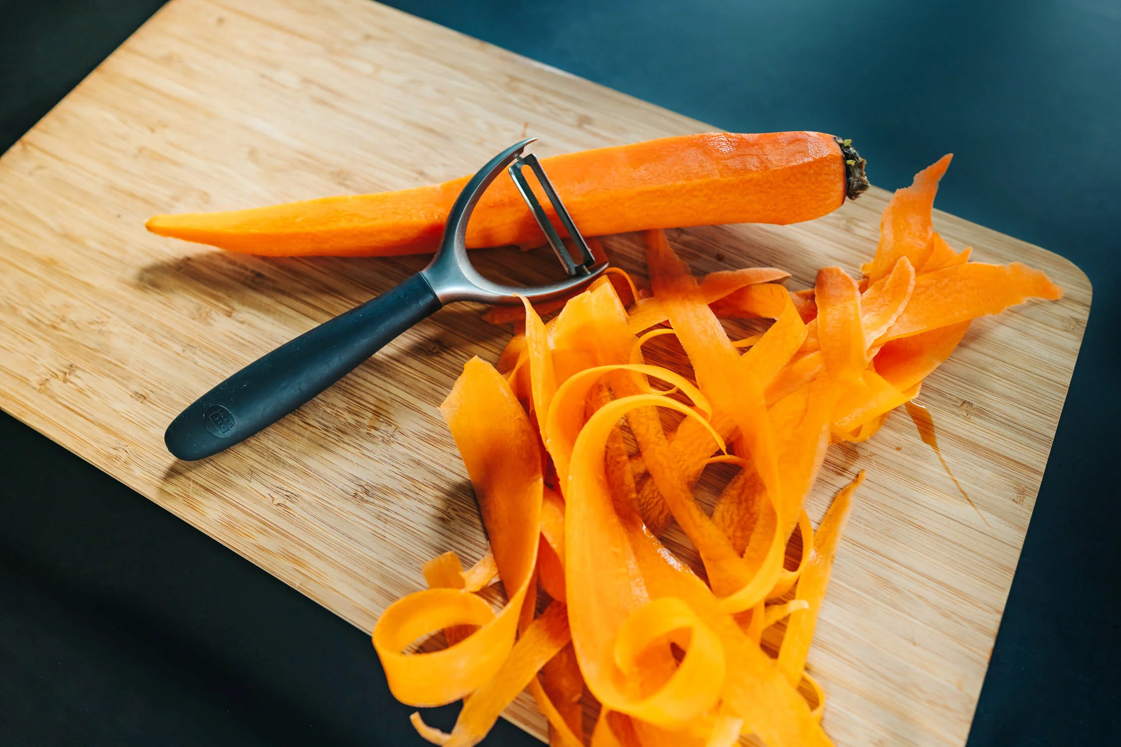 - Gather the sliced gobo and carrot and cut them into thin strips.