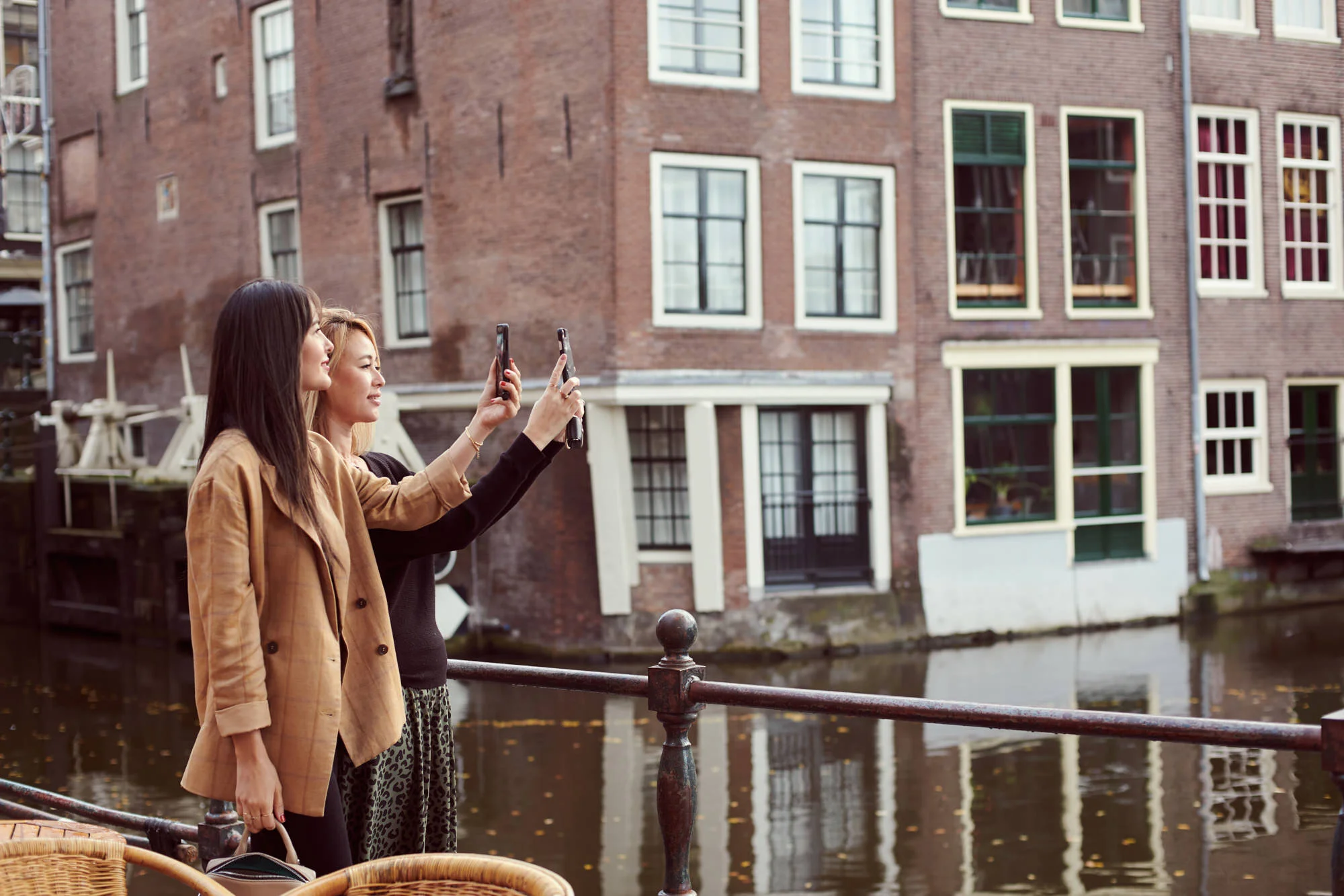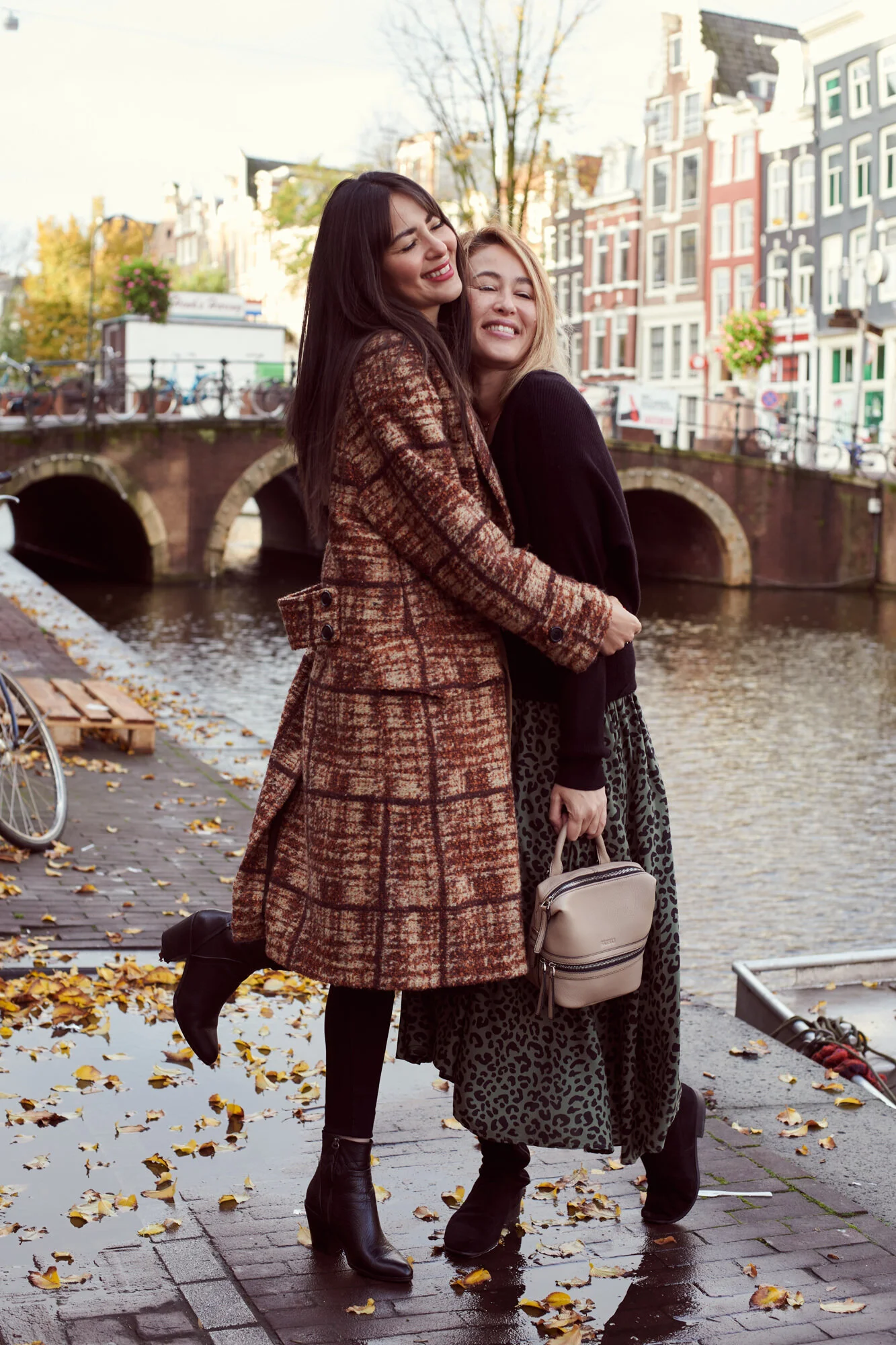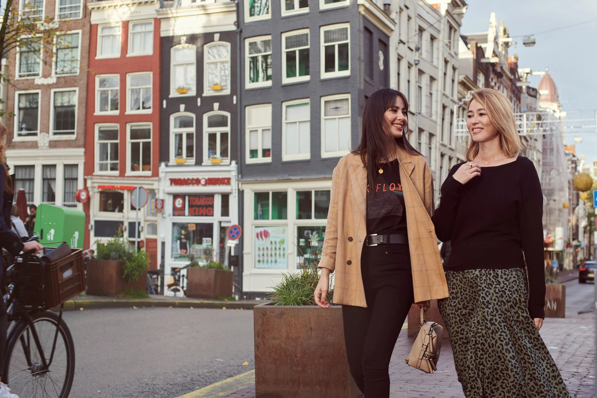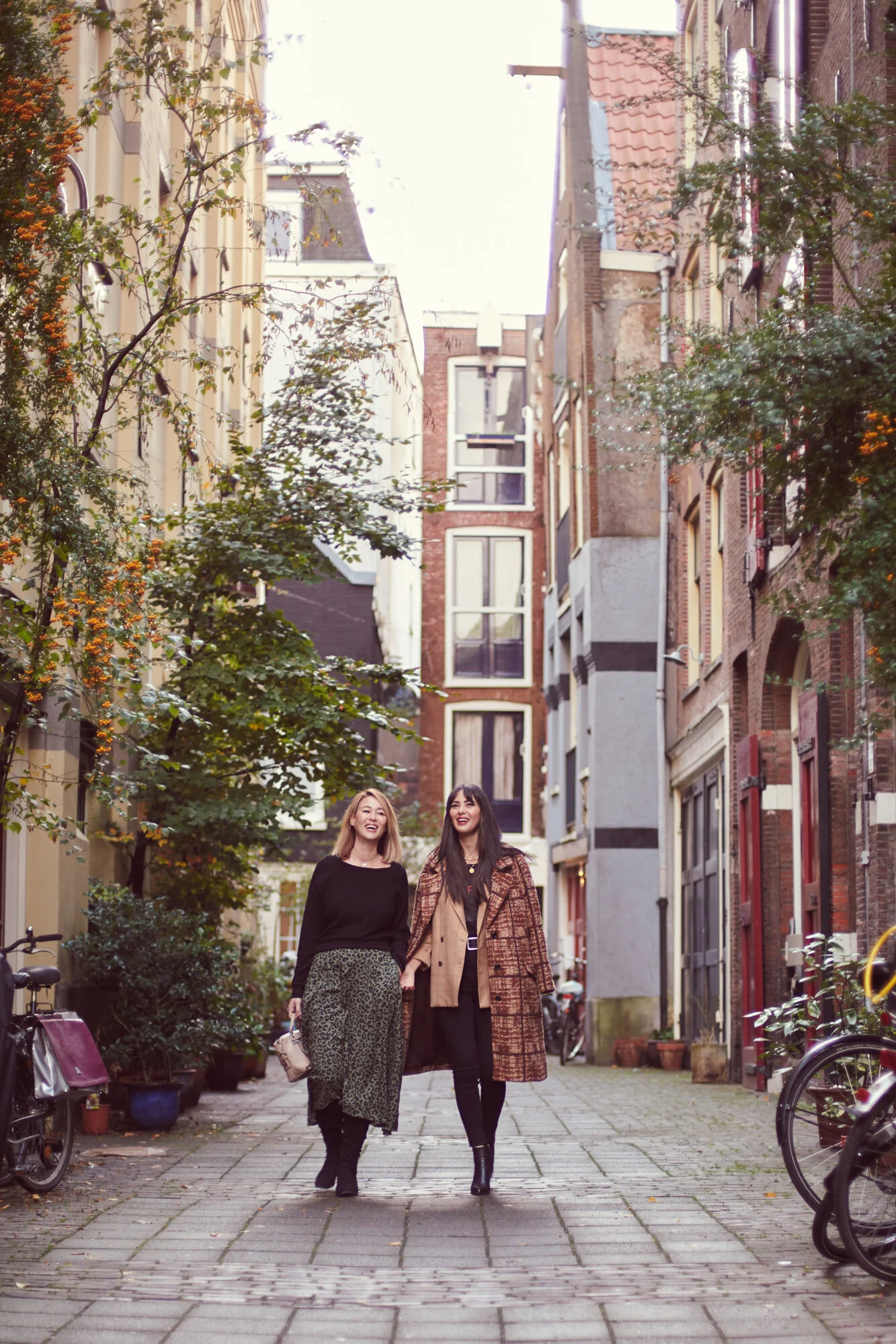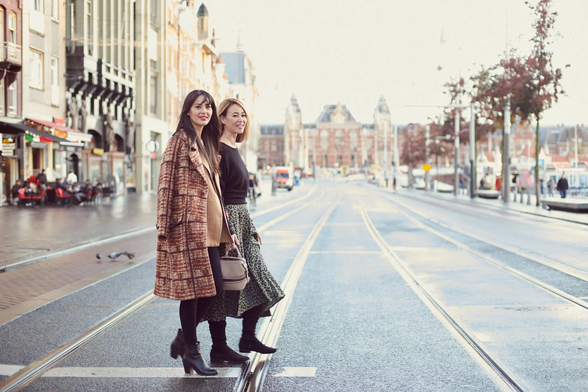 As soon as we stepped outdoors, Victoria immediately started shooting us. She wanted to capture us in our natural element as opposed to a posed shot. This was exactly what we wanted and Crystal and I like to call this “paparazzi style” shooting. We chatted as we walked from one location to to the next and once Victoria got the shot, we would continue walking around the area. We loved that she captured us walking around Amsterdam with the classic visuals of what Amsterdam is known for: the row of bicycles, the pancake restaurants, the beautiful canals, the various alleys, the Dutch architecture, and more.