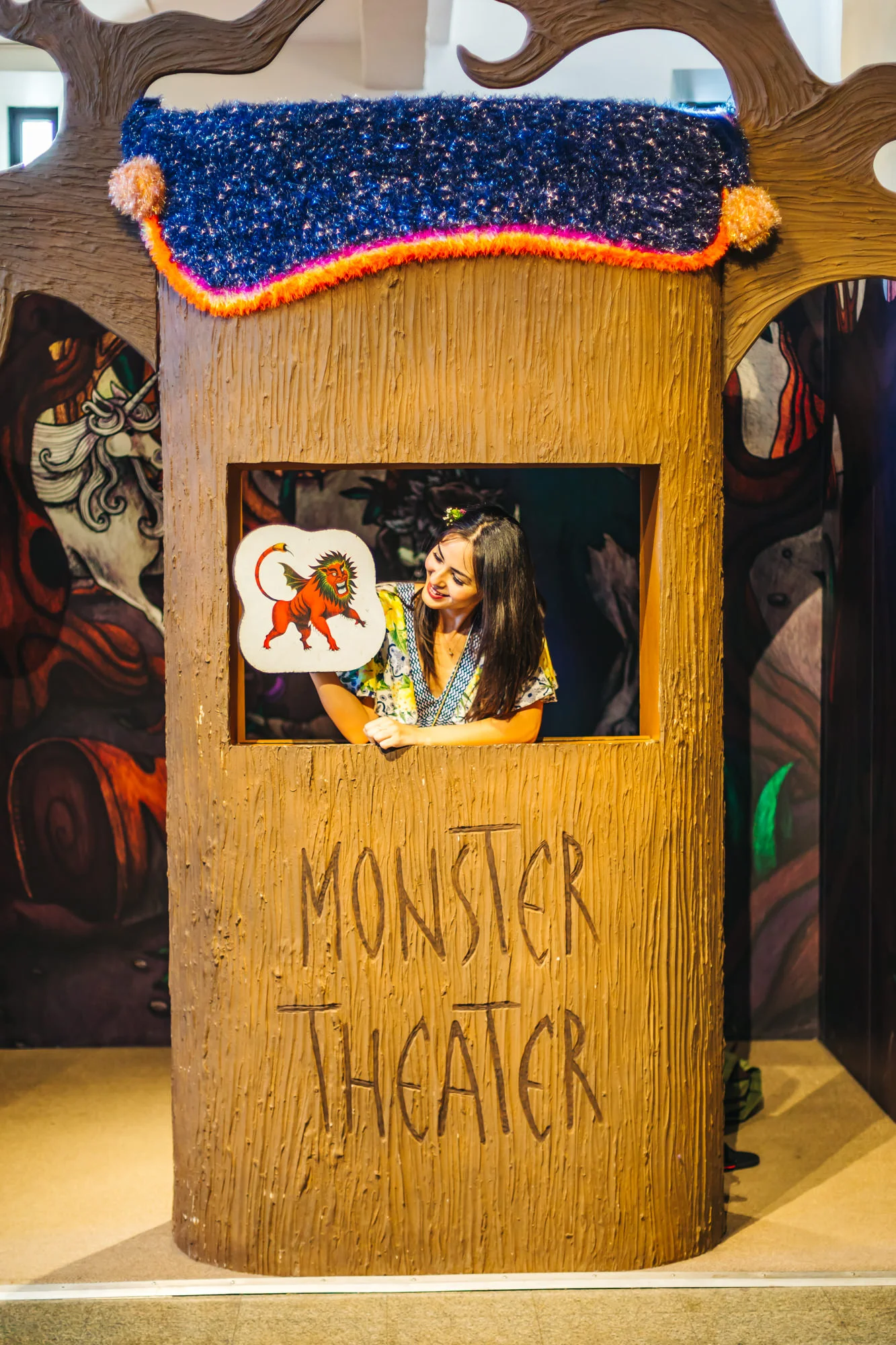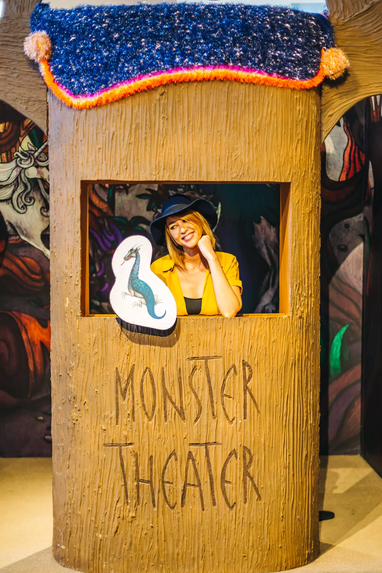 There is a cute little Monster Theater where you can put on a show with cardboard monsters and adorable stumps of wood where children can sit and watch the show. There is also a large board with sticker pieces of different body parts of animals and monsters where you can create your own monster. Another fun spot was the monster boat where we took advantage of silly photo ops.