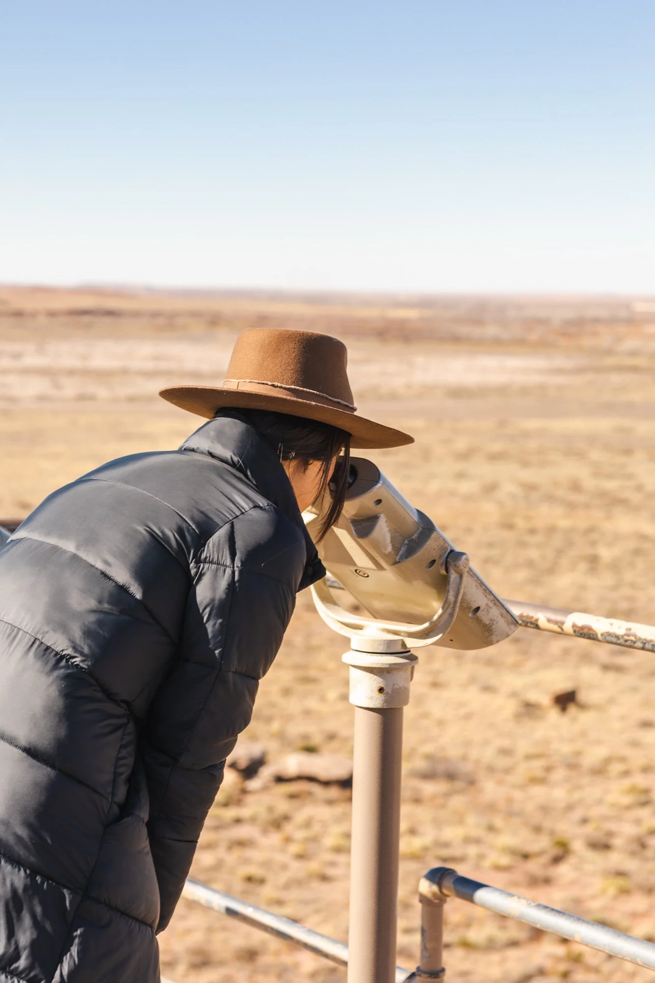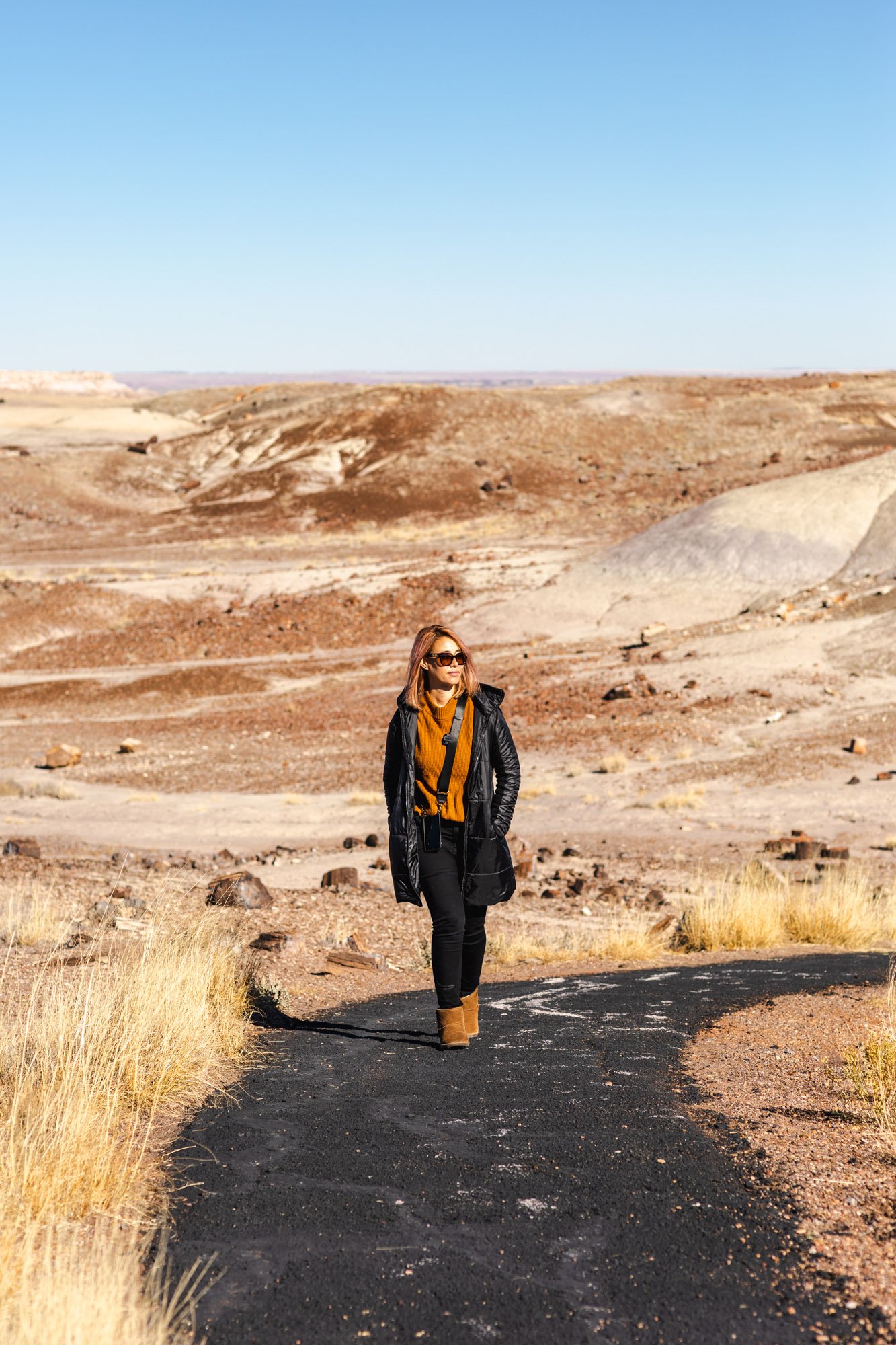 We visited Petrified Forest National Park at the end of November when the temperatures were in the high 30s (Fahrenheit) in the morning and high 50s during the day. We dressed in layers and started out with a coat in the morning and during the day, we took off the coat because it was fairly comfortable just wearing a sweater and pants.
