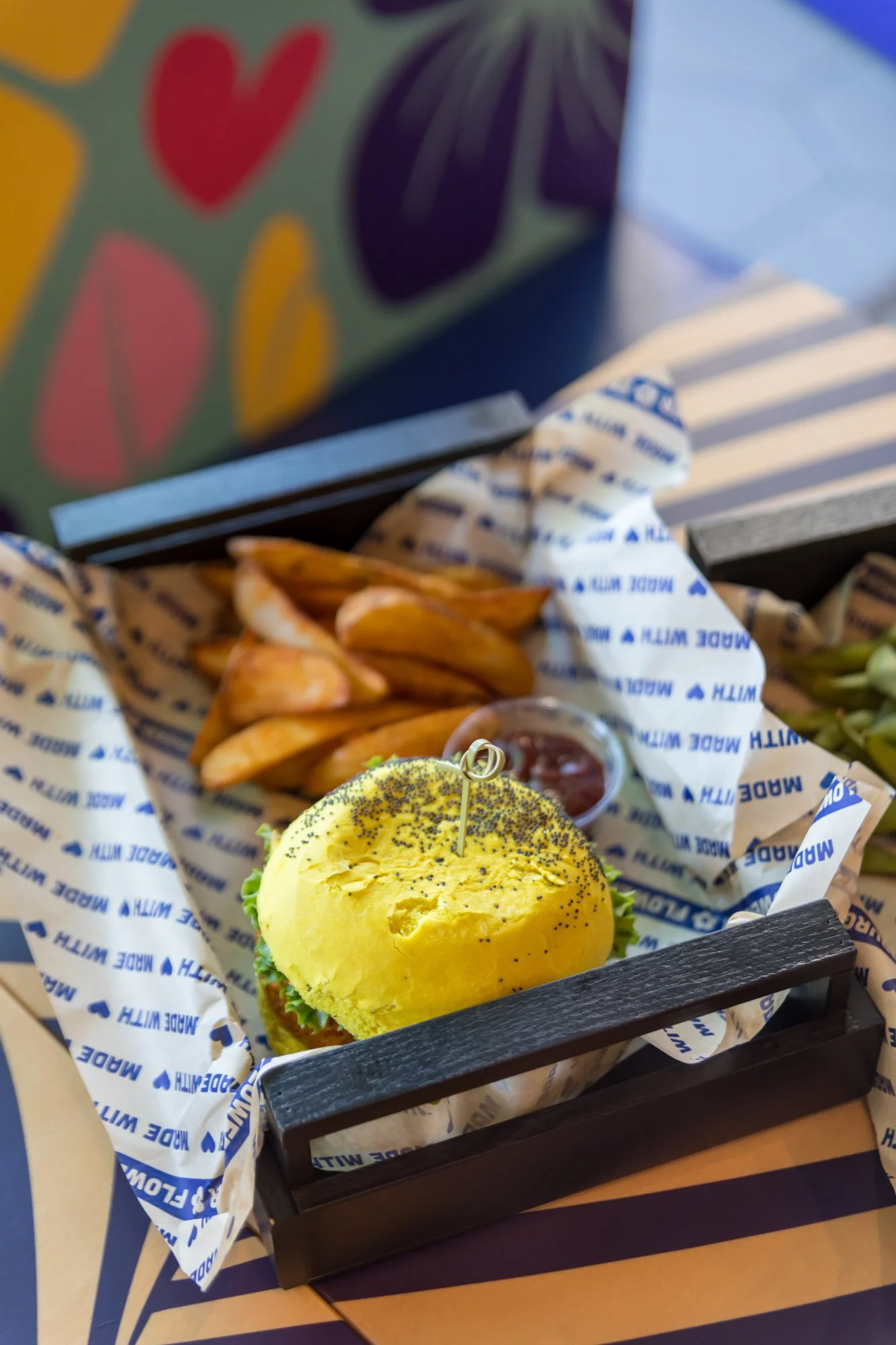 This classic burger should be called simply delicious. This one is for the chickpea fans who like things simple. The yellow whole wheat bun gets its shade from turmeric and holds the chickpea patty, Flower mayo, juicy tomatoes, and gentilina lettuce.