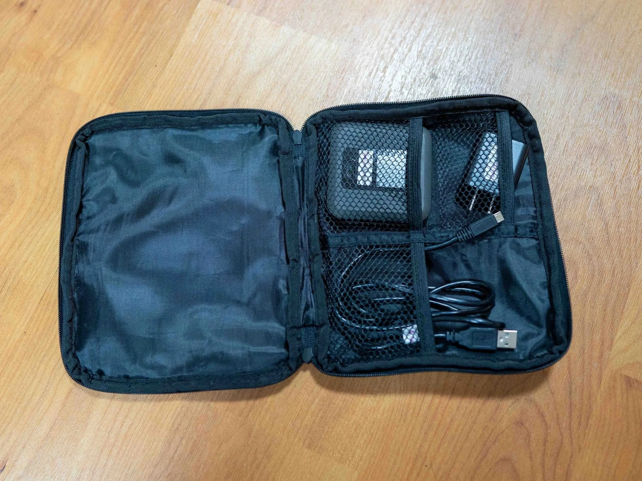 Everything is neatly organized and easy to carry, making it convenient when you're traveling. And if you ordered the portable battery, that would be tucked in here as well.