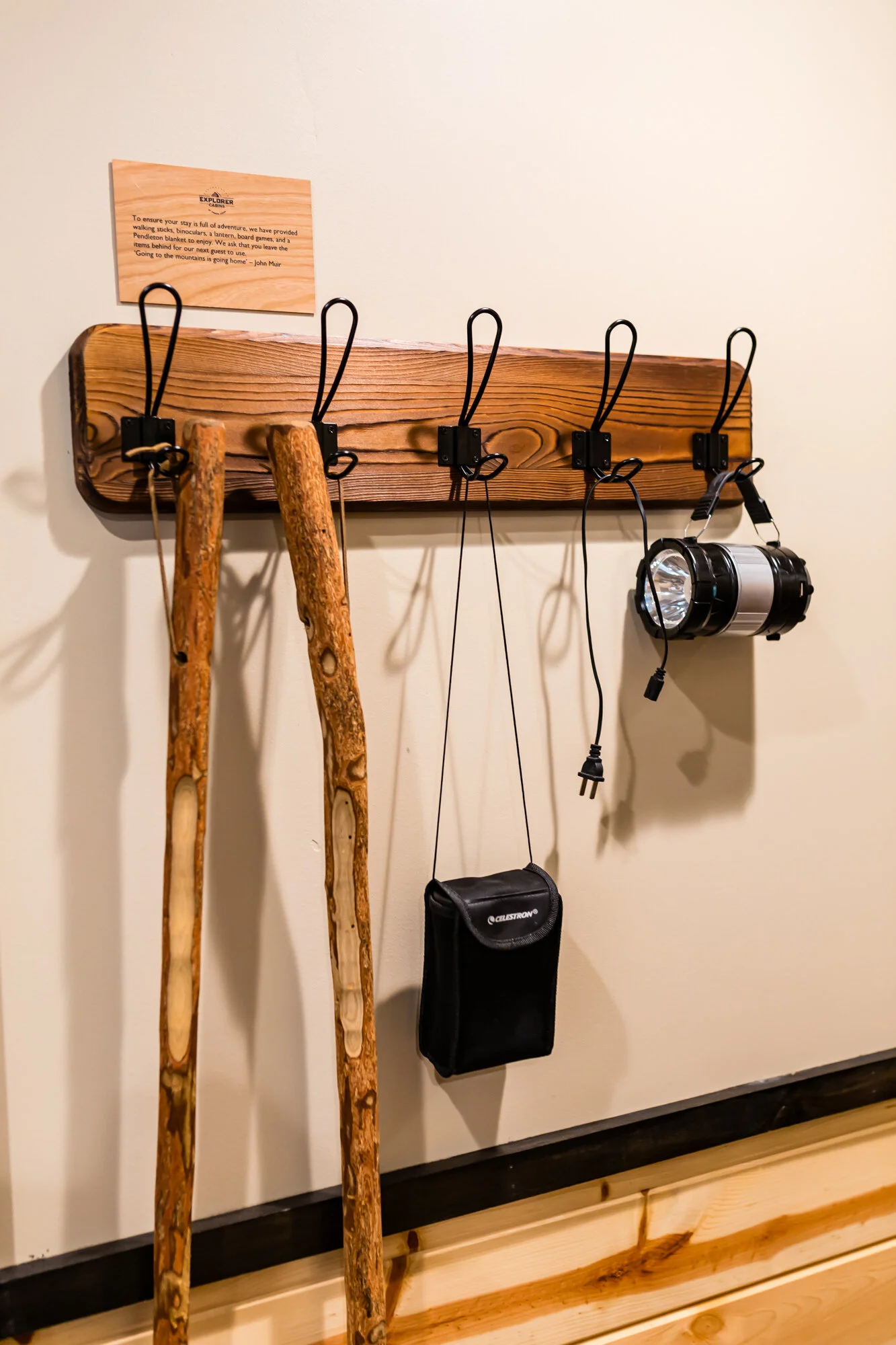 The living room also had a fireplace that was easy to turn on with a switch of a button and the lights and AC had a convenient remote control. There were also beautiful photographs on the wall that gave a glimpse into the region’s history. We really appreciated the thoughtful wilderness accessories like the hiking sticks, binoculars, and flashlight.