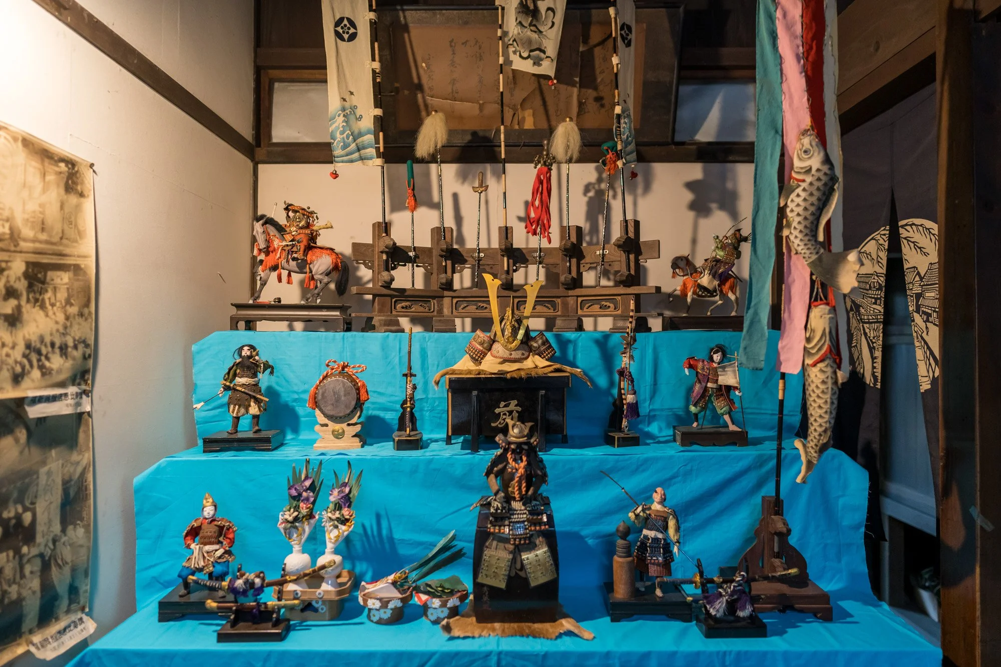 Various dolls and a samurai helmet Displayed