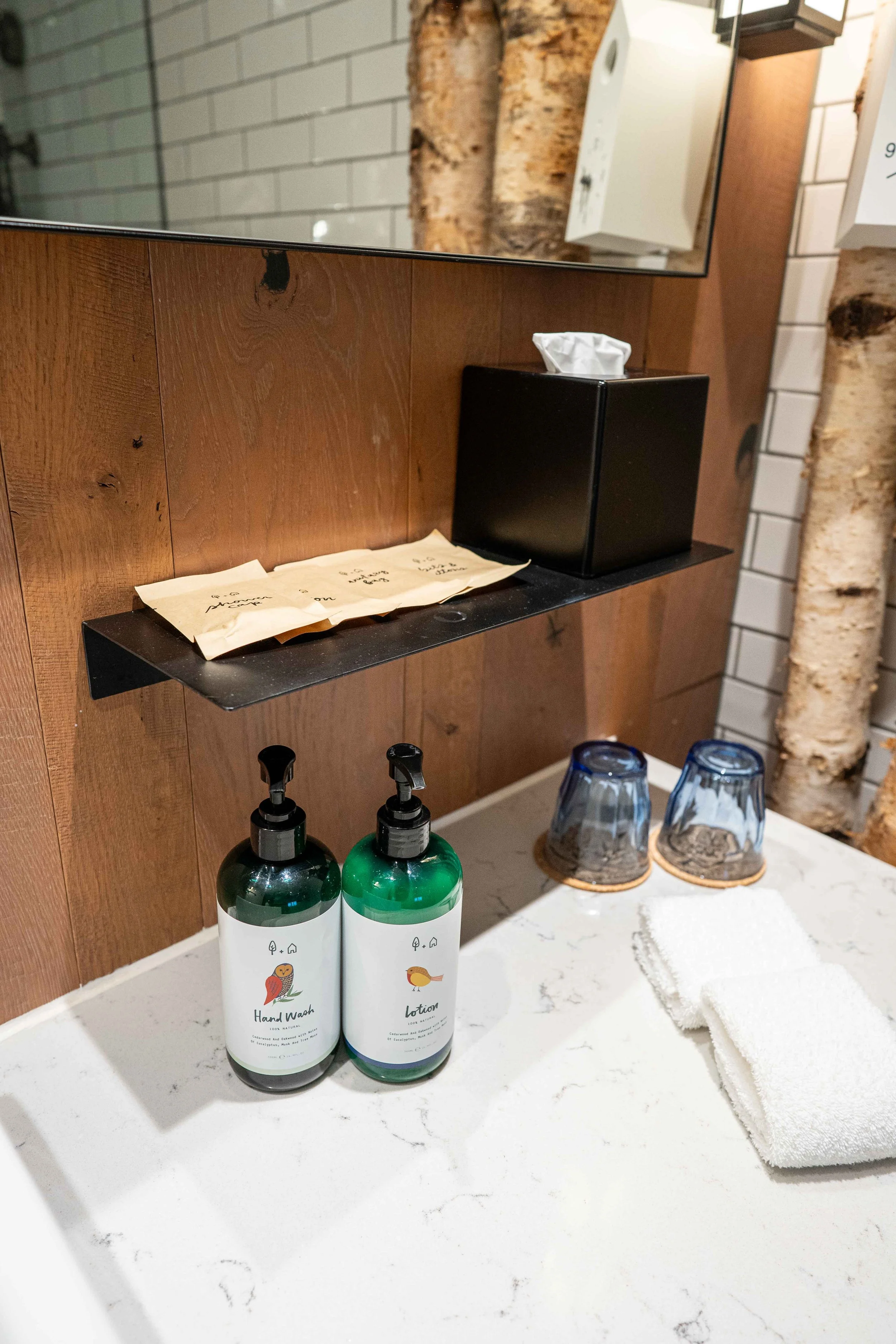 The mirror was large and the sink had a lovely vintage design to it. The counter space was on the smaller side with basic toiletries. Although the toiletries were minimal, they did not lack in design as everything was thoughtfully designed with their treehouse logo.