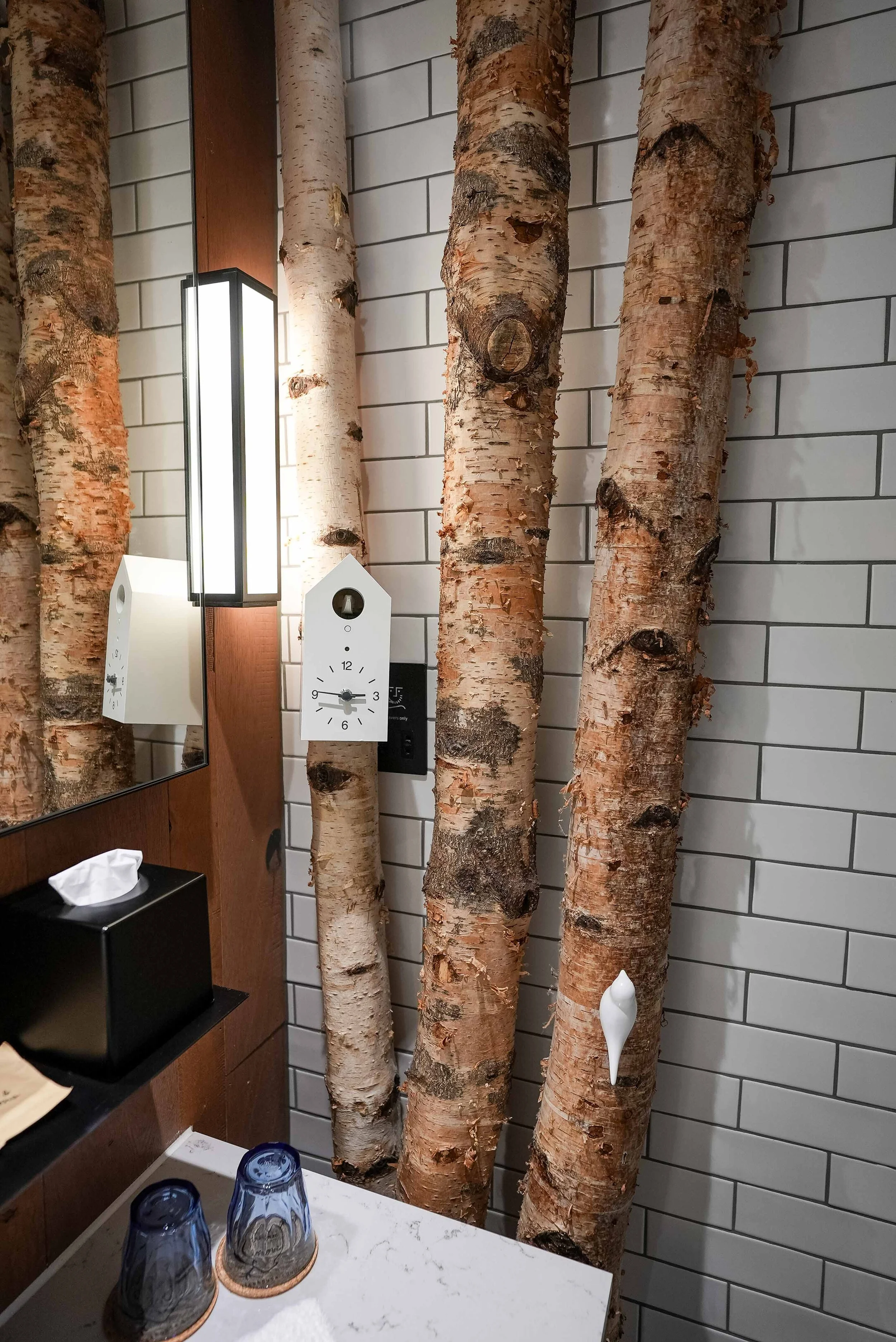 The bathroom was a spacious and bright space with birch tree trunks in the corner. We weren’t sure if they were real (they looked real), but birch is 100% waterproof and has a natural resistance to fungus and rot.