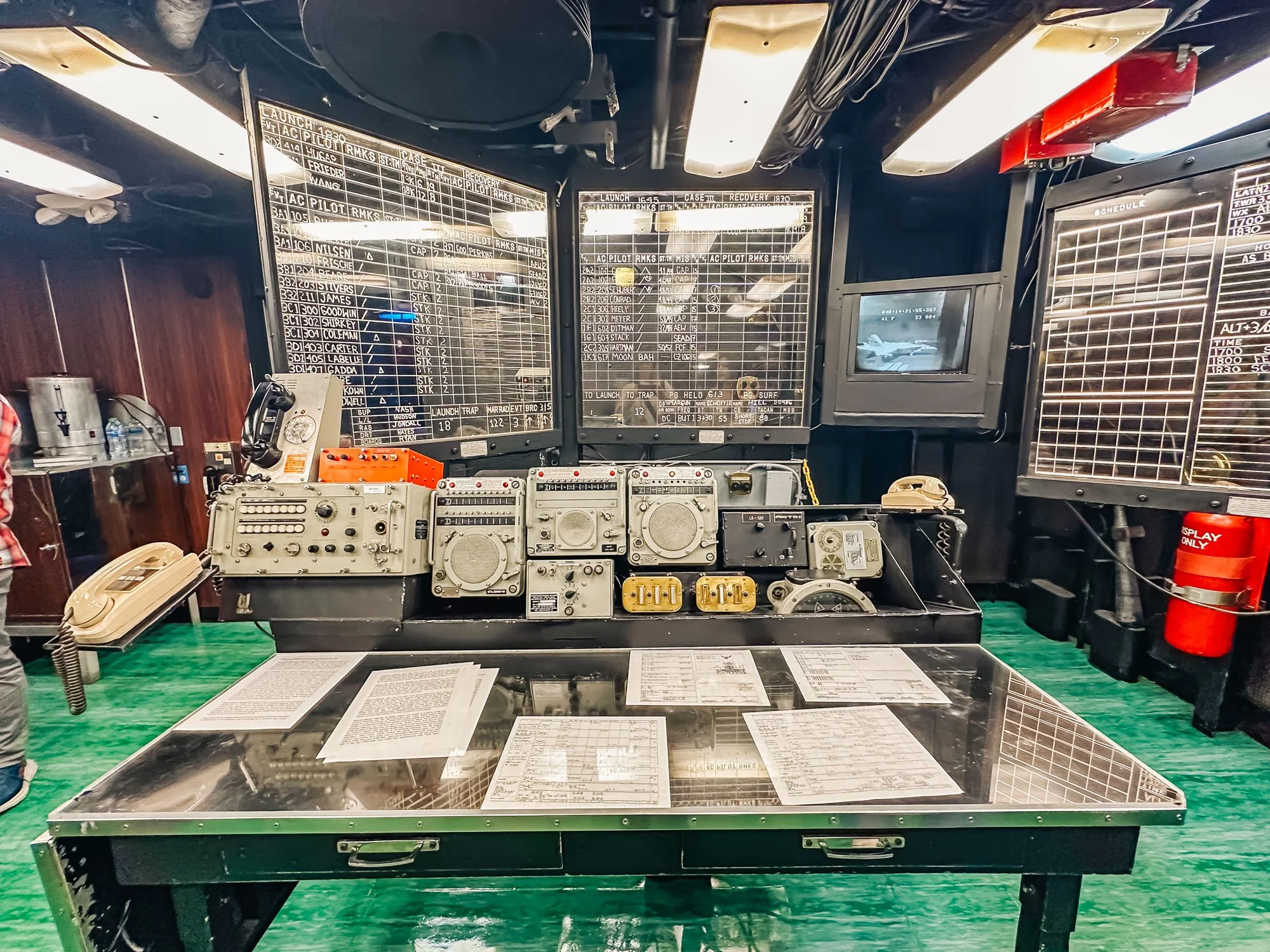 The most interesting section in this space was the clear status boards, which provided enormous amount of information about everything that was going on. We learned that the sailor in charge of writing on the status boards would have to write from the back and not the front of the board. This meant that he/she had to be very skilled at writing backwards.