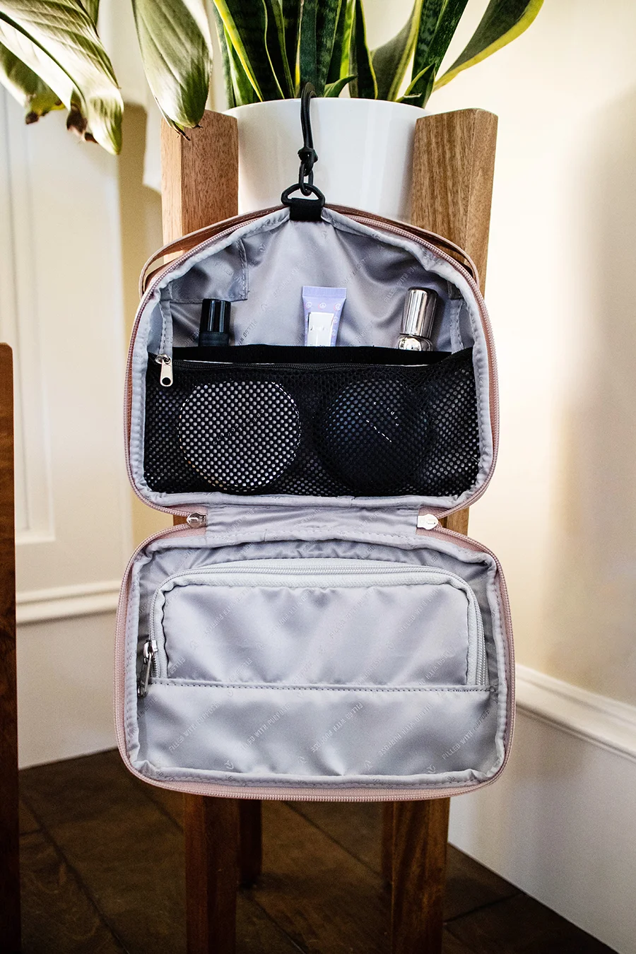 Having a bag with a hanging hook is especially handy if I have limited counter space so that I can hang it on a towel bar or anywhere else that would hold my hook. With my new Signature 2.0 toiletry bag, I no longer have to worry about my items falling out as each compartment is secured either with a zipper or an elastic slip pocket. I also like that the bag has a convenient carry handle.