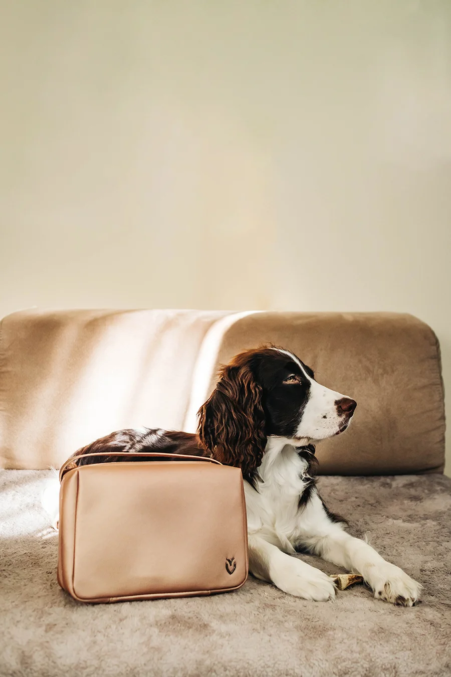 my pup Zooey posing with the Signature 2.0 Toiletry Bag in rose gold.