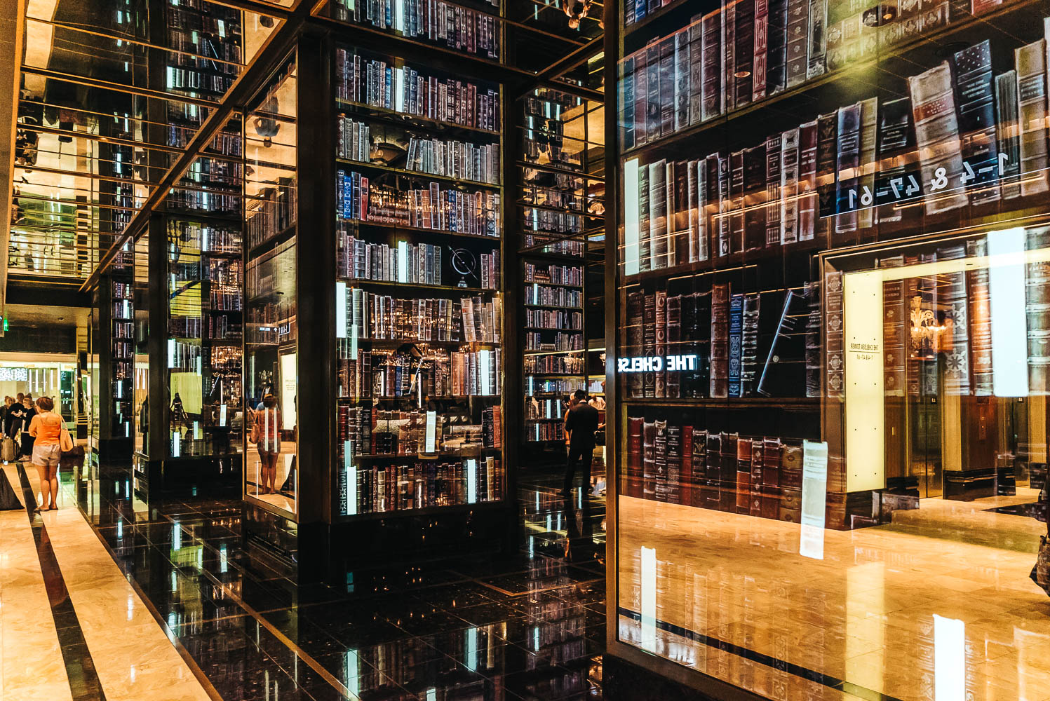 DIGITAL BOOKCASES AT THE COSMOPOLITAN. THE DIGITAL DISPLAY HAD DIFFERENT IMAGERY THROUGHOUT THE DAY.