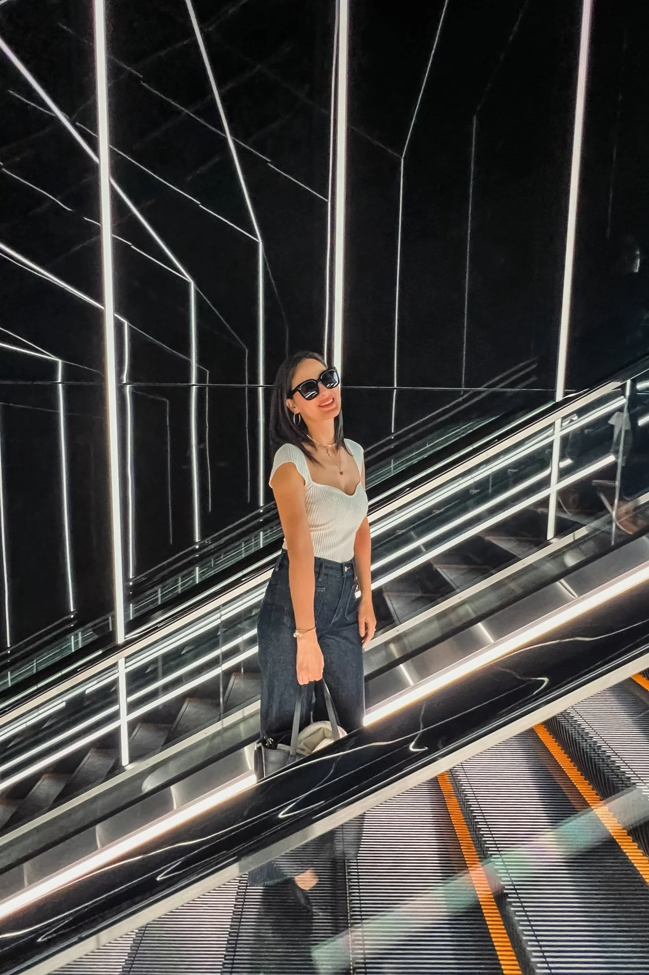 My first outfit was a classic denim and t-shirt look. I wore my favorite pair of J.Crew denim trousers and a cotton scoop neck T-shirt from Quince. I’ve had the J.Crew denim for a few seasons now, and I find myself reaching for them on almost every one of my recent trips because they work so well with various styles.