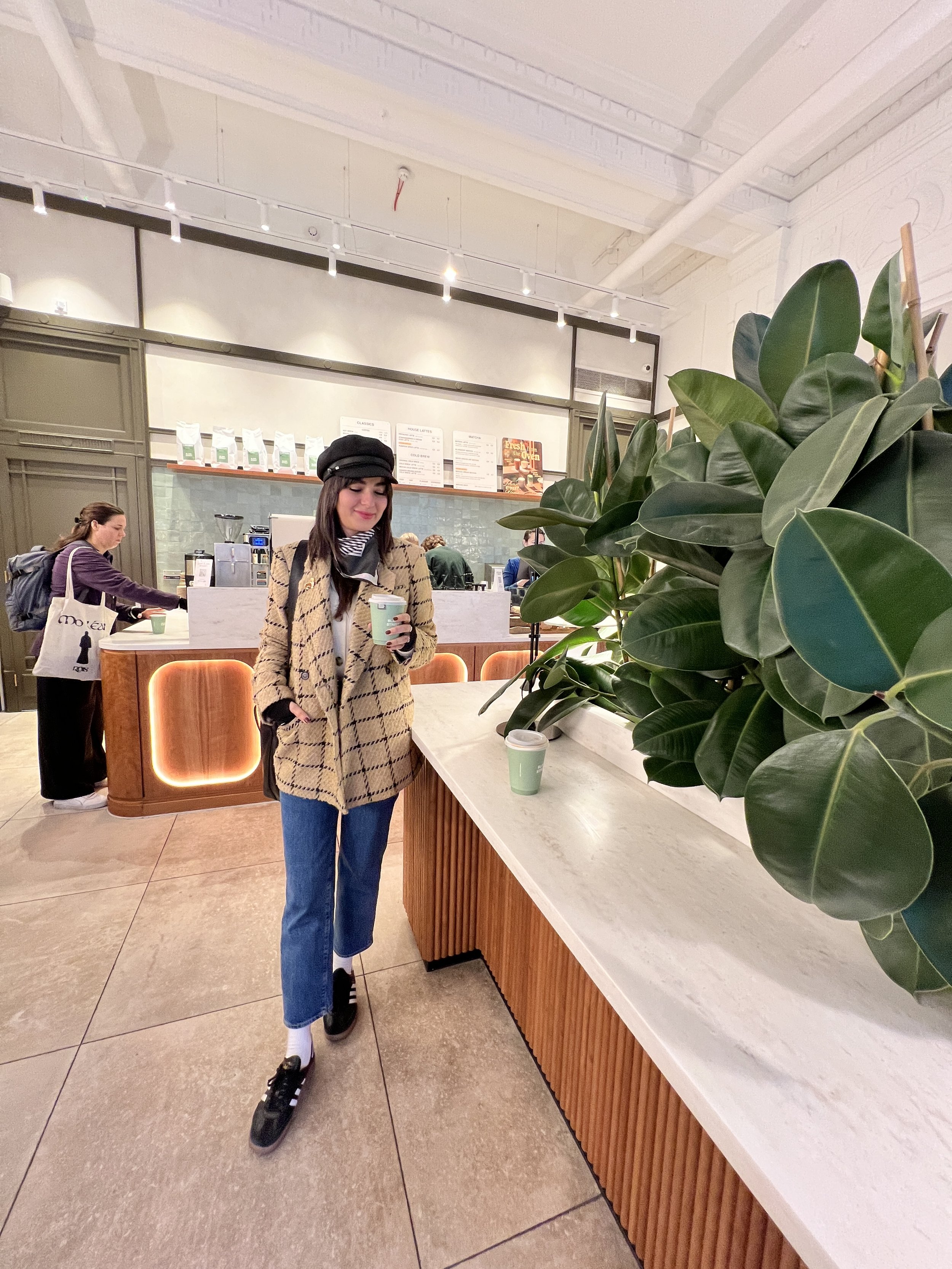 The majority of my travel outfit was from Quince. I love their affordable cashmere styles and wore the straight leg cashmere pants and shrunken cashmere sweatshirt. On top, I wore my Anine Bing blazer and for shoes I wore my Adidas Sambas.