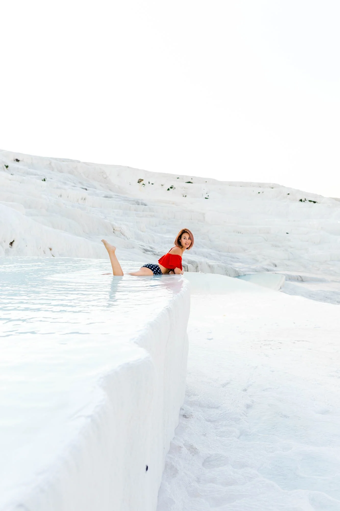 This location is known for it’s thermal springs that look like snow, so I wanted to have a bright bathing suit that would stand out in pictures. Amazon had the cutest bikini with ruffles on top and high-waisted polka dot bottom that fit real nicely and came out great in the photos. Just like I wanted.