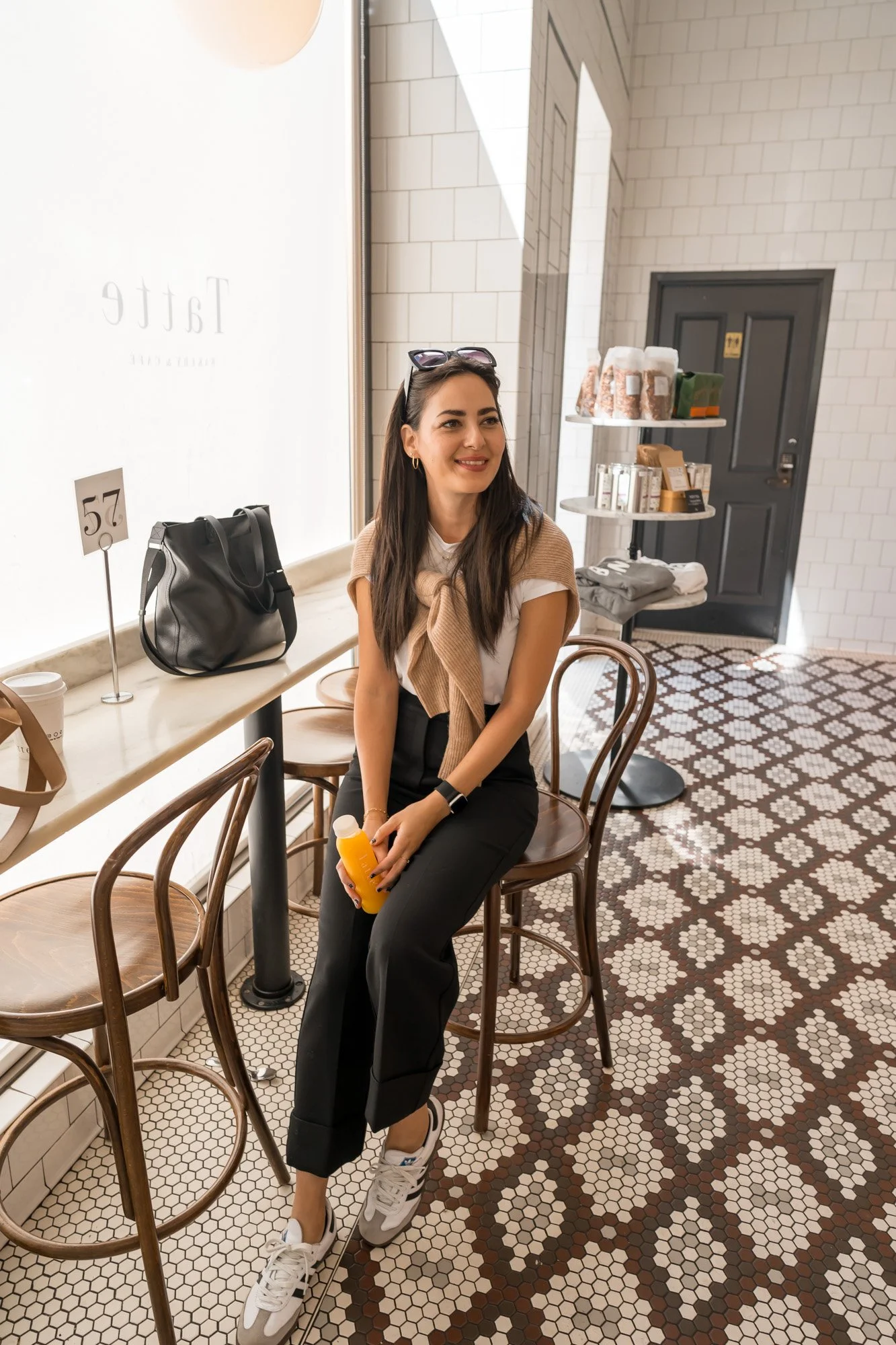 Another top I wore was my Easy Standard T-shirt underneath my Quince Zip Alpaca Wool Sweater. Whenever it got too warm for a sweater, I would effortlessly drape the cozy knit top over my shoulders, enjoying its lightweight and incredibly soft texture. The versatility of this sweater made it the perfect companion for fluctuating temperatures.